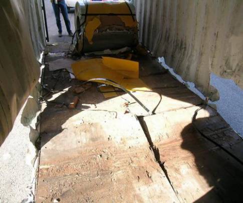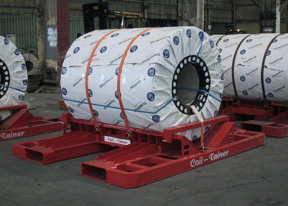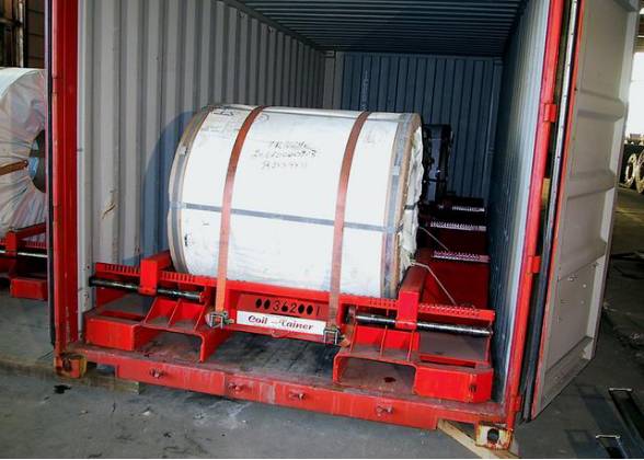 由于局部负荷较大,卷钢下应铺垫木板,以分解压力,防止箱体横梁变形、弯曲、脱焊、断裂,建议卷钢单卷重量不超过四吨,为方便铲车在箱内作业,卷钢单重适宜控制在三吨以下,否则太重,大铲车进不了集装箱内,工人只能在箱外用钢丝绳强行拖拉卷钢,野蛮作业损坏集装箱地板和箱体。