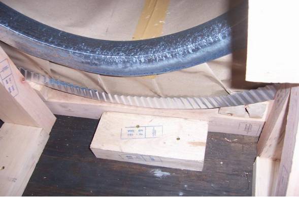 卷钢装载前认真研究绑扎计划。现在各港口的垫木均起不到分散压力的目的,只是防滑。卷钢应在船舶底板和两侧舱壁铺垫好木板,卷钢应堆放在横向防止的衬垫木条板上,至少2条。底部还要放置角木阻止滚动(有条件的话请要求角木钉在底部木板上!!!)。每排卷钢在两翼的第一卷必须靠实舱壁(有斜坡的舱垫木到位,多层木板垫的话一定要绑扎公司打捆垫实!!!),每件紧靠排放后至少2块三角木衬垫止移。装货完毕后,有必要多要一些木板和角木备用。